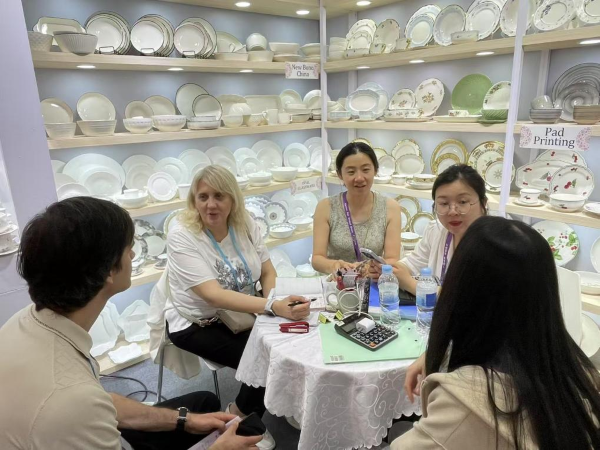 陶瓷摊位本届展出的产品,结合欧美及中东市场流行趋势设计,采用哑光釉面与手工描金工艺,既饱含中国设计的巧思,又符合海外高端家居品牌的审美偏好。不少采购商在询价时特别问到“是否可以根据本国市场调整配色和包装”,业务团队当场展示了此前为不同客户定制个性化产品的案例,专业实力收获客商一致认可。