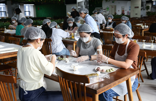 在掌握了基本要领后,员工们纷纷洗净双手,系上围裙,兴致勃勃地投入到月饼制作中。尽管很多人都是第一次尝试,动作略显生疏——有的在揉皮时力度掌握不均,导致饼皮厚薄不一;有的在包馅时手法不够熟练,馅料险些“破皮而出”——但这些小插曲并未影响大家的热情。在姚主席的巡回指导和同事间的互相帮助下,原本生涩的动作逐渐变得流畅,现场充满了欢声笑语。